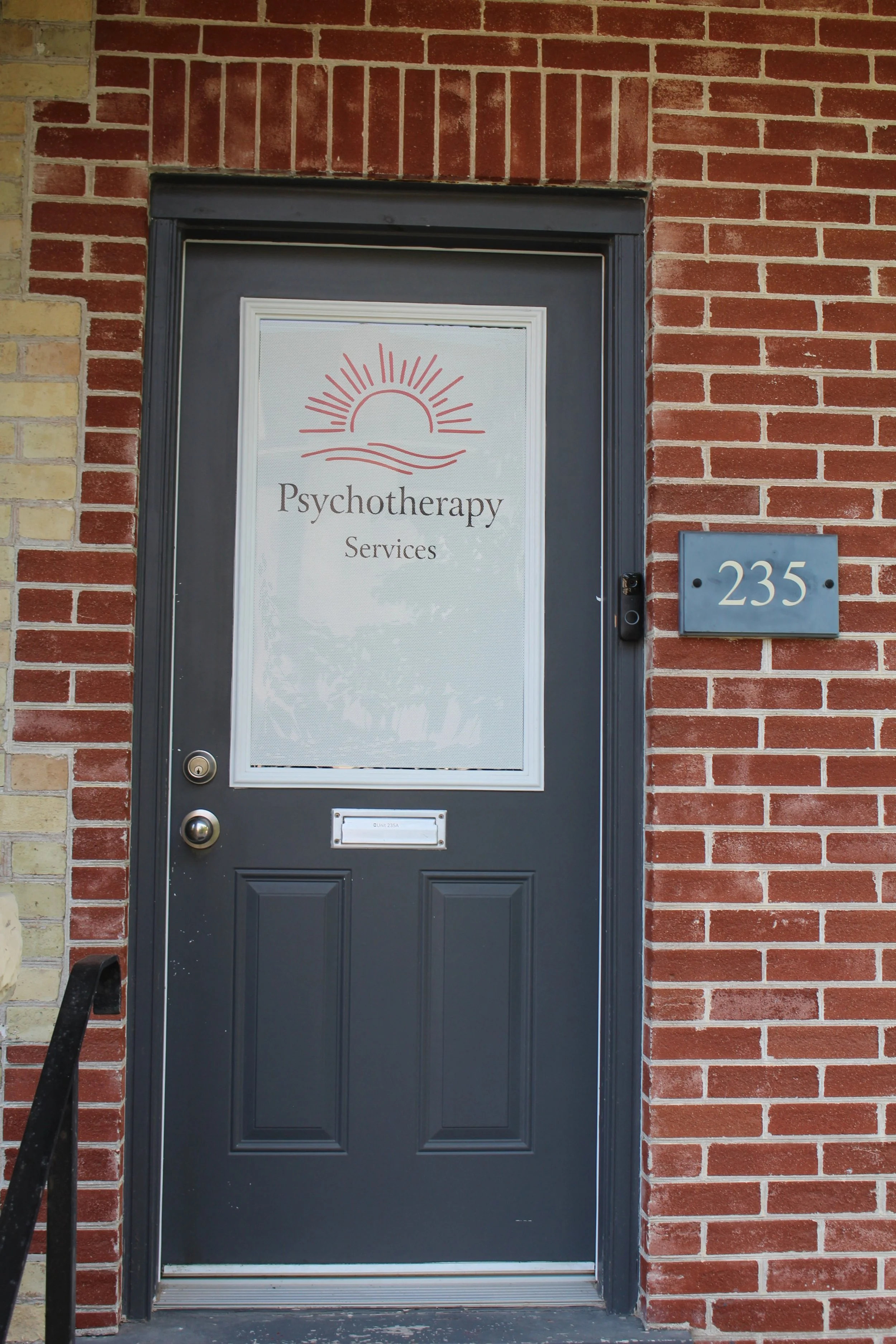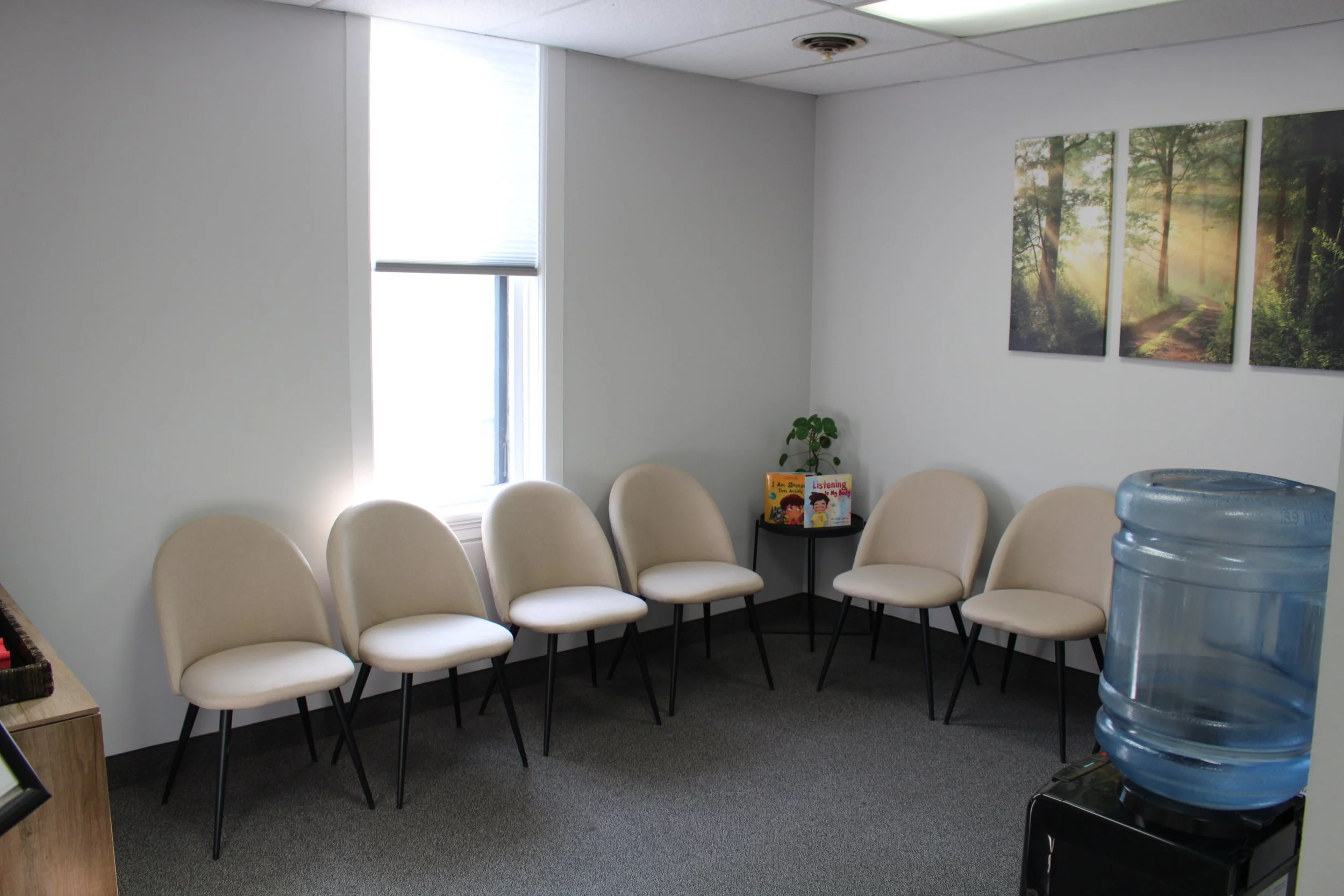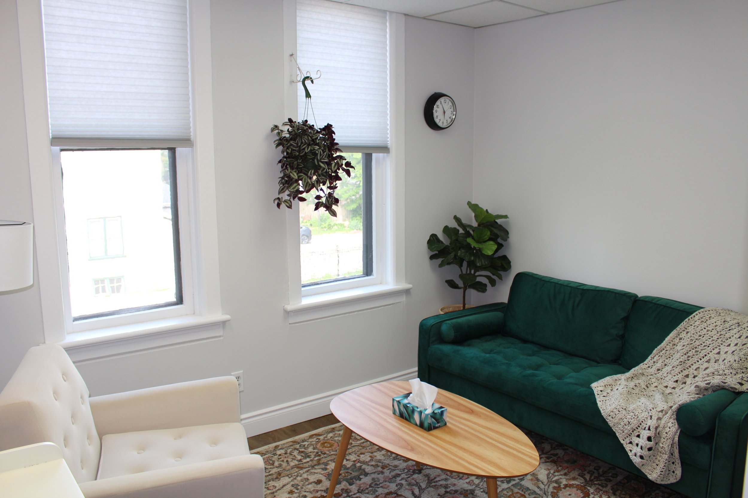The door says “Psychotherapy Services” in the window. Once inside, at the top of the stairs is a waiting room where you can have a seat until I come get you. If interested, there are complimentary drinks you can help yourself to while you wait.