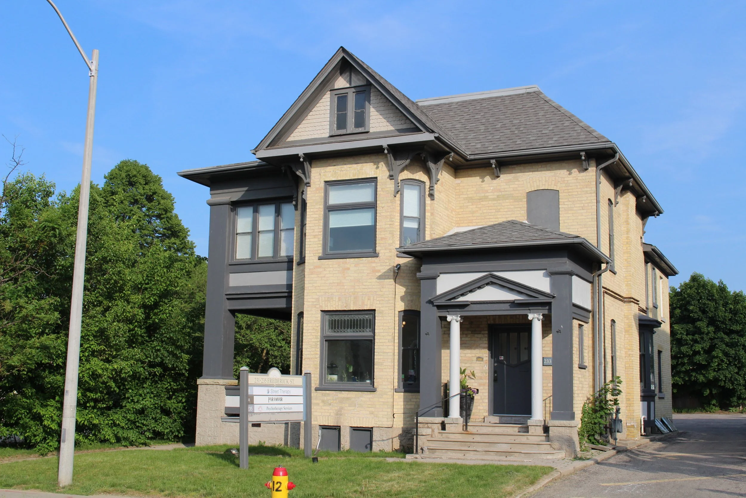 My office is located on the second floor of a house containing multiple businesses. The parking lot is around the back of the building and is free. Looking at the back of the building from the parking lot, the entrance is around the right side. Alternatively, if you do not require parking in the back and are looking at the front of the building, the entrance is on the left side.